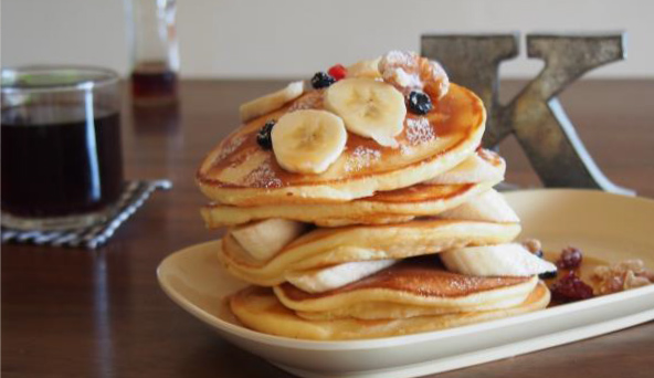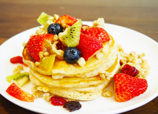 焼きたての胚芽パンケーキを器に盛り、一口大にカットしたフルーツと、お好みのナッツ、ドライフルーツをたっぷり混ぜ込んだグラノーラをたっぷりとトッピングし、ヨーグルトを添えます。プラスするなら、はちみつがお似合い。