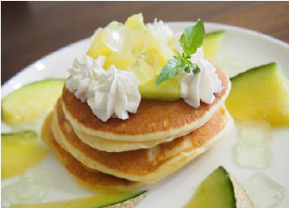 プレーンパンケーキはふんわりと焼き上げあら熱を取ります。メロンは一口大にカット、生クリームは砂糖を加え角が立つまでホイップします。パンケーキ、カットしたメロンをバランスよく盛り付け、ホイップしたクリームを絞って仕上げます。お好みで、のど越しの良いゼリーを添えても◎