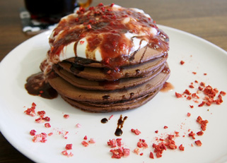 ビターチョコパンケーキはあら熱をとり、やわらかく8分立てしたホイップをトッピング。イチゴのコンポート、チョコソースをかけていただきます。ビターチョコの風味に、酸味と甘みがベストマッチ