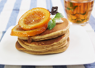 焼きたての黒糖ロイヤルミルクティパンケーキに、ブラウンシュガーでこっくりと煮詰めたオレンジのコンフィチュールとお好みでビターチョコを添えていただきます。黒糖のコクと華やかなアールグレイの香りに、さわやかなオレンジの風味が後を引く美味しさ。